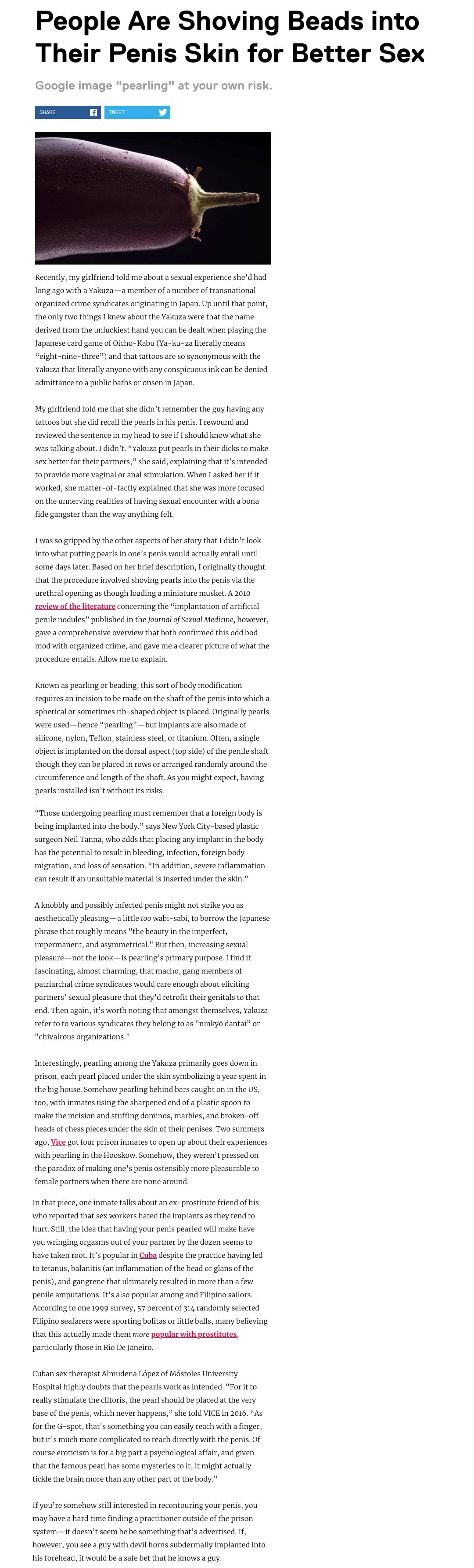 Known as pearling or beading, body modification can result in bleeding, infection, foreign body migration, and loss of sensation.
